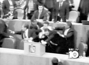 本报综合消息 15日,在墨西哥新莱昂州首府蒙特雷的一次州议会上爆发了一场闹剧,由于就一项议会提案产生分歧,两派议员竟然在议会大厅内大打出手。