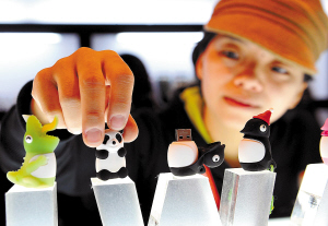 12月18日,一家台湾企业的工作人员在摆放玩偶造型的U盘。正在举行的第三届中国(北京)国际文化创意产业博览会各种主题展览展示精彩纷呈。“台北主题馆”的宝岛工艺文化精品和时尚创意设计,深具老北京文化特色的老舍茶馆、皮影戏、泥人塑像,以及综合活动、展览展示、论坛峰会、推介交易、创意活动、文艺演出等吸引来众多参观者。本届文博会17日晚举行开幕式,为期5天,有近百场活动。 新华社发