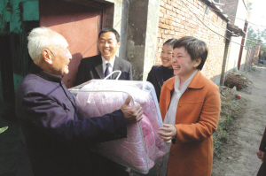 11月7日,河南万果园商贸有限公司总经理黄玉清带领员工走进空巢老人家,为老人送去了油、面、被褥等生活必需品;本报记者兵分两路,一路陪空巢老人体检、洗脚;另一路与企业员工走进社区慰问空巢老人。