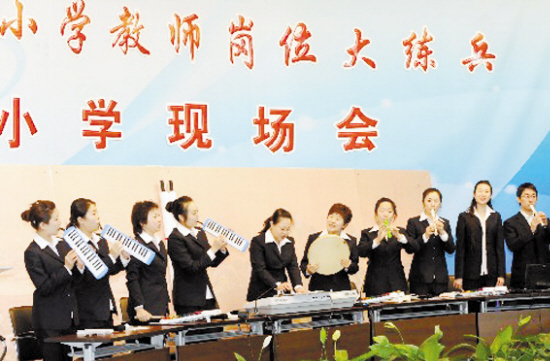 12月23日,几名教师在现场进行音乐教法演示。为提高中小学教师队伍的专业化素质,打造学习型、研究型教师团队,自2008年初开始,哈尔滨市在全市中小学教师中开展“岗位大练兵”活动。 新华社记者 李勇 摄