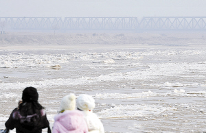 12月23日,几位游客在观赏流凌。受较强冷空气影响,自12月22日凌晨,黄河济南段出现今冬首次淌凌现象,较去年冬天首次淌凌提前了23天。目前,济南黄河河务局已全面恢复24小时防凌值班制度,密切关注凌情变化。 新华社发