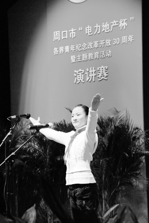 本报讯 “是改革开放改变了周口面貌,是改革开放为周口绘制了美好画卷……”12月24日下午,由团市委主办的周口市“电力地产杯”各界青年纪念改革开放30周年暨“解放思想 改革创新 开放开明”演讲比赛在周口人民会堂举行,来自我市48个行业和部门的1200多名干部职工聆听了演讲赛。