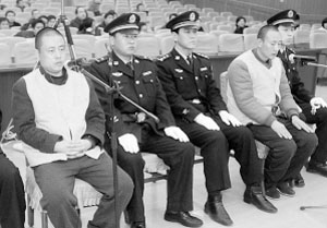 12月26日,被告人张玉军(左一)、张彦章(右二)出庭受审。