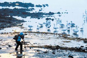 12月28日,一名摄影师在荣成大天鹅自然保护区烟墩角海湾拍摄天鹅。每年冬季,山东荣成市的大天鹅国家级自然保护区都会聚集上万只来自西伯利亚等地的野生大天鹅和各种珍禽,且到此越冬的大天鹅数量正逐年增加。越来越多的国内外摄影爱好者到此拍摄。