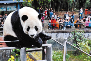 12月28日,来自四川地震灾区的大熊猫在为市民进行爬铁梯表演。当日,福州市民为来自四川的大熊猫举行“灾区大熊猫,新年好!大家都来看望你”为主题的大熊猫迎新年活动。2008年6月24日,四川地震灾区的4只大熊猫被疏散至福州熊猫世界,它们在饲养人员的精心照料和训练下,不仅改变了毛色,增加了体重,还学会了爬铁梯、爬树等表演。