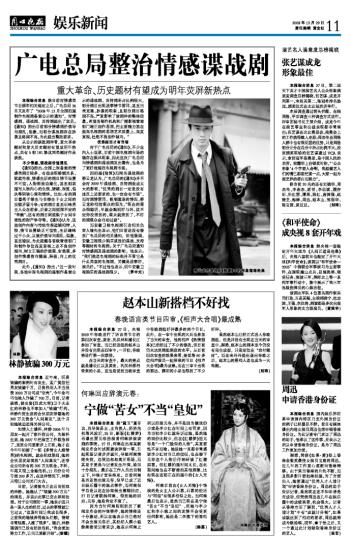 本报综合消息 继日前对情感类节目颁布相关规定之后,广电总局26日又发布了“2008年12月全国拍摄制作电视剧备案公示的通知”,对情感剧、谍战剧、反特剧提出了意见。《通知》指出目前部分情感剧价值导向混乱、偏激,而部分谍战剧存在抄袭且格调不高,为此提出整改要求。