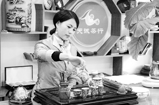 喜欢品茶的市民越来越多,一些市民对茶文化的了解也越来越多。昨天,在市区文明路天诚茶社,茶艺表演让前来品茶的市民不仅一饱眼福,同时也学到一些泡功夫茶的知识。晚报记者 朱鸿 摄
