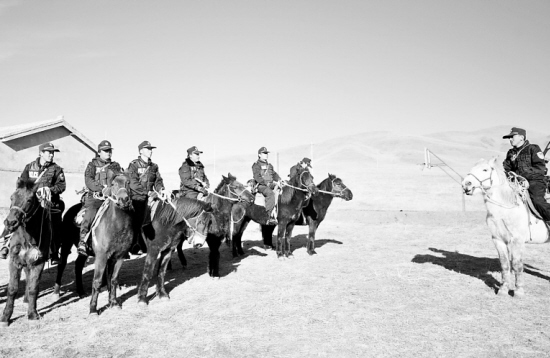 12月24日,骑警队在出发前整队集合。甘肃省甘南藏族自治州玛曲县由于地广人稀,社会治安难度较大,玛曲县公安局2003年成立了一支由20名汉、藏民警组成的草原骑警队,骑警队常年驻扎在草原深处,在面积超过1万平方公里的玛曲草原上定期巡逻,为牧民追回被盗牛羊、调解纠纷,抓捕逃犯,成为牧区的守护神。新华社发