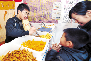 12月30日,邵立成(左)在包装顾客挑选好的商品。日前,21岁的山东经济学院大四学生邵立成用平时积攒的1万多元奖学金和借来的4万多元在学校门前开设了一家烤红薯店,开始了自己的创业之路。现在邵立成和两位志同道合的同学一起又开始筹划他们的第二个“专卖店”,扩大自己的烤红薯事业。新华社发