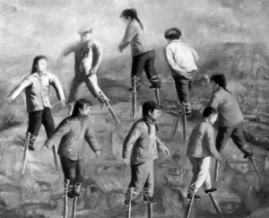 京津一带的高跷,演员常表演“单脚跳”、“劈叉”、“过障碍”等高难技巧;有的则用单脚表演从四张高桌上一跃而下等绝技。