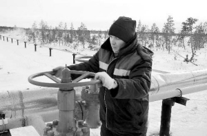 俄天然气工业股份公司的工人在西伯利亚的一处油田操作输气管道阀门。