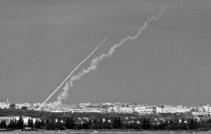 1月2日,哈马斯从加沙北部发射的火箭弹拖着尾烟飞向以色列目标。
