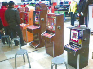 该“游戏厅”正对着电梯口,7台大大小小的赌博机整齐地摆成一排(上图)。赌博机前人头攒动,丁丁当当的投币声、吐币声,机器转动的鸣叫声以及赌客的叫骂声,合成了“游戏厅”特有的“交响曲”。