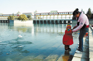 2009年的第一天,周口大闸上游的沙河河面基本全结冰了,最厚处达到了近4厘米。在大人的帮助下,一幼儿在冰上玩耍。