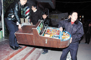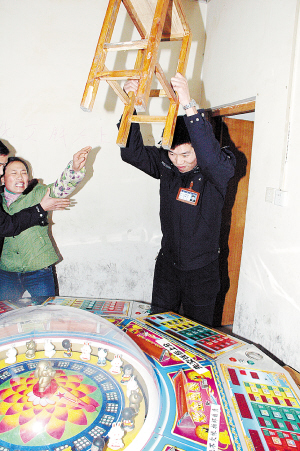 为进一步加强辖区娱乐场所管理,昨天晚上,七一路派出所所长张晓东带领民警又查封并捣毁了育新路一家从事赌博的游戏厅,游戏厅老板被民警带回派出所接受处理。在查处现场,所长张晓东带头拿起板凳将赌博机砸毁,让游戏厅再无赌具“生存”。