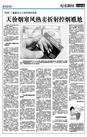 直到几个月前,中国国家烟草专卖局通过了《中华人民共和国境内卷烟包装标识的规定》。不过,这份规定基本沿用了我国卷烟包装原有内容,在警语面积上,选择了《公约》要求的最低限度30%;警语底色允许使用与包装底色相同或相近的颜色;警语字体高2毫米(小六号字)就算达到要求。