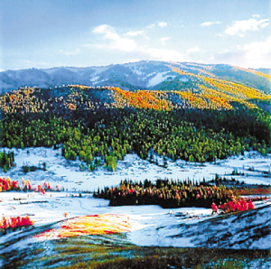 乌鲁木齐位于天山北麓,准葛尔盆地南端,环山带水,沃野广袤。另有别称,叫“优美的牧场”。城正中有红山,小巧而陡峭,状如飞来之物。山顶有一座九级砖塔,称镇龙塔,高耸入云,映衬着远处的雪山。城东是海拔5400多米的博格达峰,晶莹闪光,极为壮观;城南有雄伟壮丽的天山山脉,峰峦叠嶂,雪峰皑皑,气象万千;城西有充满神话色彩的妖魔山,那是《西游记》中牛魔王的寓所,东可望白雪皑皑的博格达峰,西可赏赤火通红的西山落霞,北可看鲤鱼翻腾逐浪,南可见燕戏碧水间。