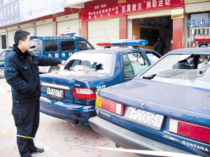 昨日上午,记者赶到郸城县城西关世纪大道事发现场看到:3辆保安巡逻车玻璃被砸破(如图),碎片散落周围5米多远;地上还扔着施暴者留下的钢盔和砖头等。在该公司二楼办公室内,办公桌横七竖八,一块玻璃匾被砸碎。