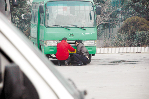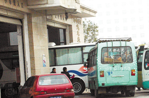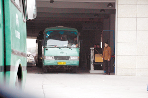 旁边一人无意向记者透露:“这辆绿色客车今天很忙,已经跑了好几趟了。”他又说,其他跟这辆车一样的绿色客车都没动,不知是不是这些不动的绿色客车都通不过检测。