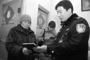昨日,在市区七一路办事处新华社区,市公安局沙南分局七一路派出所民警为贫困户送来户口簿。据了解,自开展“全国公安民警大走访”爱民实践活动以来,七一路派出所民警深入辖区困难家庭结对帮扶,并为贫困户开辟“绿色通道”。晚报记者 朱海龙 摄