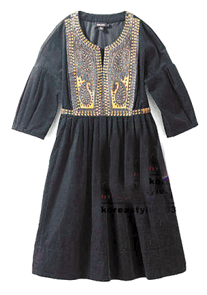 刺绣连身裙,腰部的褶皱效果,能够掩盖水桶腰。
