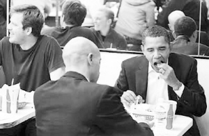 10日中午,奥巴马与华盛顿市长芬蒂到当地市中心一间著名的热狗快餐店进餐,由于正值午餐时间,店内大批顾客见到奥巴马大驾光临,无不欢喜尖叫。奥巴马向顾客打招呼并拍照留念,又抱起一名婴儿,尽显亲民一面。