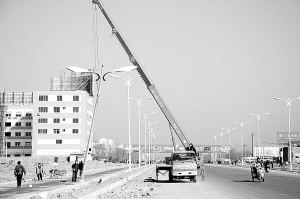昨日上午,工人们安装市区大庆路两旁的路灯。