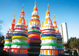 1月14日拍摄的由乒乓球等装饰的西双版纳风情灯组。当日,用乒乓球和其他塑料彩球装饰而成的“版纳风情”大型灯组亮相大连劳动公园。整个灯组共使用乒乓球和各色彩球15万多个。 新华社发 徐德武 摄