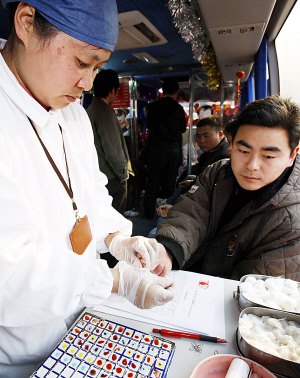 1月14日,一名血站工作人员(左一)在为一名返乡旅客验血。近日,设立在上海火车站南广场的移动采血车每天都要接待120多位主动献血的旅客。这些献血者中有大学生、公司职员,但大多为外来务工者。