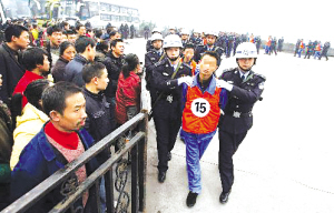 1月16日,重庆市公安局将30名扒手分别押至该市渝中区朝天门、菜园坝长途汽车站、渝北区龙头寺汽车站等主城区4个人口密集地区,请市民辨认和举报。该市公安局方面称,这些扒手几乎都是惯扒,且全部是最近在他们作案时抓到的。之所以押到车站闹市,是希望曾经失窃的市民现场辨认和举报,同时也是警方对扒手作案现场的恢复、重建等系列案侦工作手段。重晚 摄