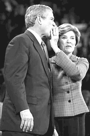 2004年,在选举活动中,劳拉为布什擦去脸上的口红唇印。