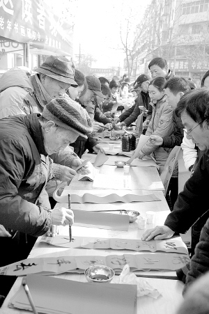 在市区主会场,“义写团”成员忙得不亦乐乎。晚报记者 朱海龙 摄