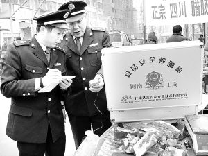 昨日早晨7时许,市区八一路农贸市场已经热闹起来,置办年货的市民忙于挑选购买,工商执法人员忙于对各类食品质量进行检测(如图)。在一家生鲜猪肉摊前,工商人员将专门检测仪器的探测针刺入猪肉里,不到5秒钟就检测出了结果:“梁老板,经现场检测,您经销的猪肉含水量70%,符合标准。”“‘食品安全检测箱’的使用,不仅避免了过去用眼看、鼻闻、手摸等方式对食品质量进行辨别,还可在短时间内做出准确判断。”工商执法人员对这个“百宝箱”爱不释手,并告诉记者:“有了它,对食品进行抽样、检测非常便利,并能及时发现问题。”