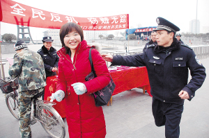昨日上午,在市区五一广场,一民警在一位挎包女青年的配合下演示并讲解小偷的惯用偷盗手法还介绍了街头防盗抢和防骗的技巧和方法。当日,市公安局反扒、禁毒、出入境等部门的数十名民警来到五一广场,开展多种形式的治安防范宣传活动。晚报记者 朱海龙 摄