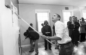 本报综合消息 美国总统奥巴马在就职前一天卷起袖子干活,充当油漆工和装潢工,以配合小区服务界在他就职之前的庆祝活动。