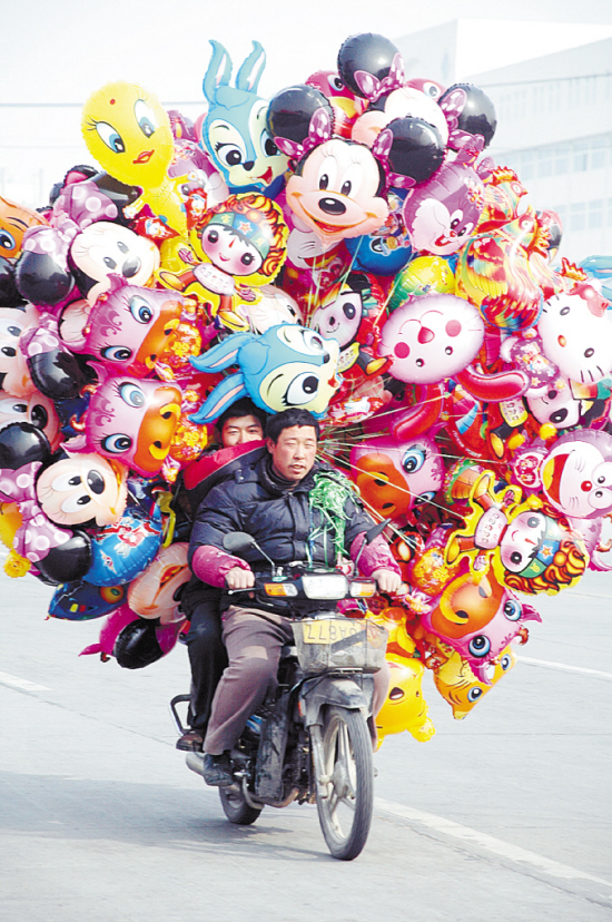 正月里,五颜六色的气球很受人们的喜欢,特别受小朋友的青睐,这让卖气球的小贩赚足了一笔。看,载了一车的气球像一朵彩云飘来,几乎要把摩托车拉“飞”了。 晚报记者 朱海龙 摄