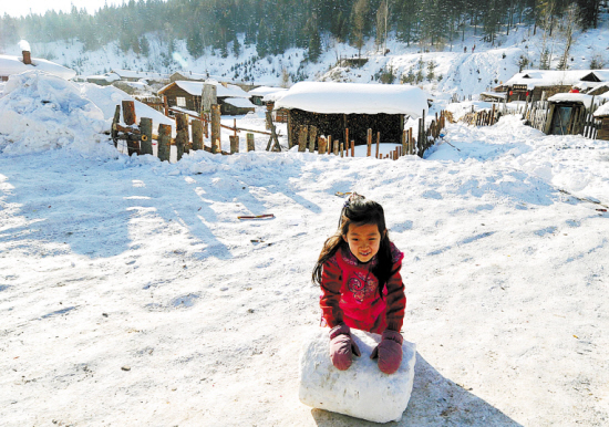 1月31日,孩子在雪乡玩雪。位于黑龙江省牡丹江西南部的大海林林业局双峰林场,由于受日本海暖湿气流和贝加尔湖冷空气影响,冬季降雪期长,积雪期达7个月,积雪厚度可达2米左右。这里的雪质好、粘度高,积雪从房檐悬挂到地面形成了独特的“雪帘”、树挂等美景,让人如同步入了童话般的冰雪世界,有“中国雪乡”的美誉。 新华社发