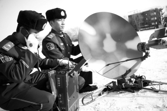 2月2日,武警战士进行卫星背负站使用演示。当日,武警黑龙江总队举行第24届世界大学生冬季运动会安保反恐新装备演示活动,以检验武警部队在大冬会期间防范、处置突发事件的应急反应能力。据了解,为顺利完成大冬会安保任务,武警黑龙江总队新配备了12台特种车辆和500余件特种装备。新华社发