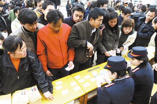 2月3日,南昌火车站工作人员来到没通铁路的江西丰城市隍城镇田南村为农民工送来返程车票。为解决农民工买返程票难问题,南昌铁路局南昌火车站10年来主动与务工大县、务工大乡、镇政府联系,调查民工返程情况,组织多个小分队将预订返程票送到农民工手中,不收取送票费用。 新华社记者 宋振平 摄