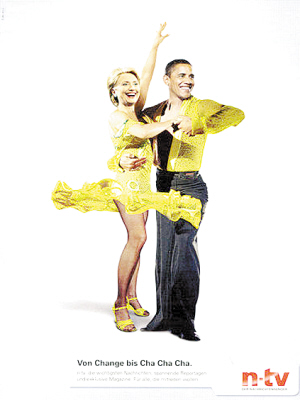 德国一家电视台日前推出了一则广告,广告中美国新任总统奥巴马、国务卿希拉里身着舞蹈服装跳起了恰恰,法国总统萨科齐也成了冰舞选手。 新华社发