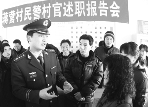 2月4日,秦皇岛市洋河口边防派出所民警兼蒋营村党支部副书记李亚磊(左一)向村民述职后征求群众意见。新年伊始,秦皇岛边防支队洋河口边防派出所组织召开民警村官述职报告会,民警“村官”向辖区群众汇报过去一年的履职尽责情况,征求辖区群众对边防派出所的意见建议,与村民共同探讨辖区治安防范等问题。2008年,河北公安边防总队驻秦皇岛、唐山、沧州沿海一线33个边防派出所的95名民警分别担任各辖区行政村的支部副书记。这些民警村官不拿工资,在村党支部的领导下分管治安、民调工作,有力维护了辖区社会治安秩序,密切了警民关系。新华社发
