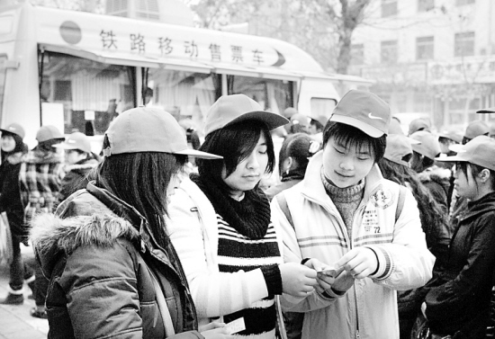2月5日,在移动售票车前,几位即将外出打工的青年在查看刚刚买到的车票。当日,为方便农民工购买火车票,西安火车站的移动售票车开到陕西省富平县,为即将奔赴江苏昆山打工的90名外出务工人员送票上门。据了解,这是西安火车站送票下乡村活动的第一站。 新华社记者 丁海涛 摄