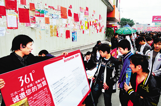 泉州晋江陈埭镇溪边乌桥头招工现场,外来工在看招聘信息(2月4日摄)。2008年下半年以来,民营经济发展迅速的福建省泉州市经受住金融危机第一波冲击,未出现大量企业倒闭、工人失业、农民工提前返乡现象,全市150多万名外来工稳定就业。泉州市总工会介绍,泉州实施品牌战略、大力拓展国内市场、加大技术创新,市内企业在新的一年继续呈现良好发展态势,