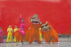旱船划起来,腰鼓敲起来,秧歌扭起来……现场的表演精彩纷呈。当天上午9时未到,市区五一广场已经成了一片欢乐之海。赛场上,各参赛队员精神饱满、演出投入,极富艺术感染力。市城市信用社代表队的舞狮表演(如图)赢得满堂喝彩,周运集团客运一公司代表队的盘鼓声震云霄,荷花路办事处表演的旱船项目《白蛇传》阵容强大、形式新颖,把整个文艺比赛推向了高潮……观众们的笑声、掌声、叫好声不断。丰富多彩的演出内容、激越铿锵的锣鼓声表达了周口儿女对美好家园的歌颂,表达了对幸福生活的追求与向往。