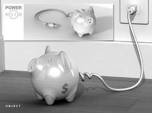 这款存钱罐不仅可以用来存放零钱,还可以帮助你养成节约用电的习惯。它采用了传统的小猪造型,猪尾巴为一根电线,猪鼻子则是一个插座。但是它可不仅仅是起到延长线的作用哦。想要用电就要向存钱罐里面投入硬币。每投入一个硬币你就可以用电30分钟。30分钟之后,电源会自动切断。想要再用还要继续“破费”。