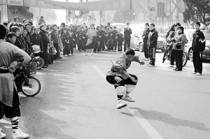 “5个、6个、7个……12个”身穿深蓝运动服的6岁的张晨,长吁一口气,连翻12个跟头后,稳稳地站在地上,赢得围观市民雷鸣般的掌声。八一路与七一路交叉口,一支来自周口三通武校由近50人组成的武术队声势浩大,走在最前面的5名队员身着红色表演服,不时挥动长鞭子,表演起双鞭、单鞭等功夫,干脆利落的身手,潇洒英武的动作,让市民在赞叹之余深感意犹未尽。