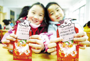 2月9日,苏州敬文实验小学的两名女生展示老师发给她们的“红包”里的祝愿卡。当天是苏州市中小学开学首日,苏州敬文实验小学的1460余名学生意外地收到了老师发给他们的“红包”。和传统红包不同,这些“红包”里装的是老师写的祝愿卡,祝愿孩子们在新学期取得进步。 新华社发