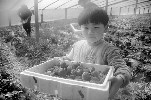 沐浴着和煦的初春阳光,置身于绿色田野,采摘娇艳欲滴的草莓,第一时间品尝香甜可口的鲜果滋味…… 春节假期刚过,随着早春草莓的逐渐成熟,市区太清路北侧的草莓大棚里,采摘草莓的市民开始多了起来。图为昨天上午,一小朋友随着大人走进草莓大棚摘草莓,享受春天的乐趣。晚报记者 朱海龙 实习生 王媛媛 摄