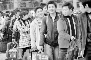 昨天下午,在周口火车站广场,许多乘客排队等候上车,两名笑得很甜的小伙子“闯入”记者的镜头。记者在和他们闲聊中得知,他们乘车南下打工,打算通过自己的努力实现新年愿望。晚报记者 朱海龙 实习生 王媛媛 摄