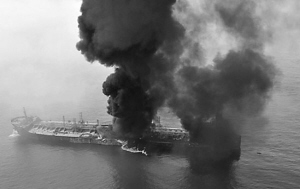 本报综合消息 2月10日,一艘装载大约3万吨冷凝油的油轮与一艘集装箱货船在迪拜阿里山港附近航道相撞后起火。(露里)